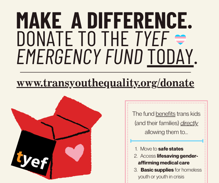 Donate to the Trans Youth Emergency Fund at TYEF Today: Families have been calling constantly since the 2024 election, fleeing to safe states for their children. Any donation helps a family and a trans kid in need seek safety and necessary supplies! Families are immensely grateful for your support. (All families are vetted- apply today if you need assistance- email contact@transyouthequality.org for more information).